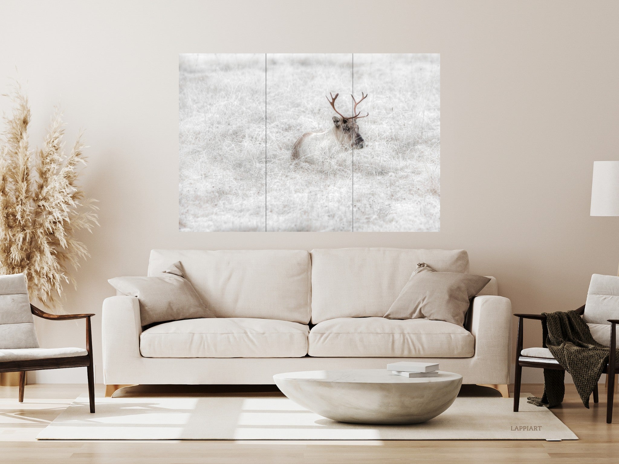 Lokakuun alku, ensimmäinen kuura maastossa. Poro lepäämässä kauniilla kuuravuoteella. ASIAKKAIDEMME EHDOTON SUOSIKKITAULU!