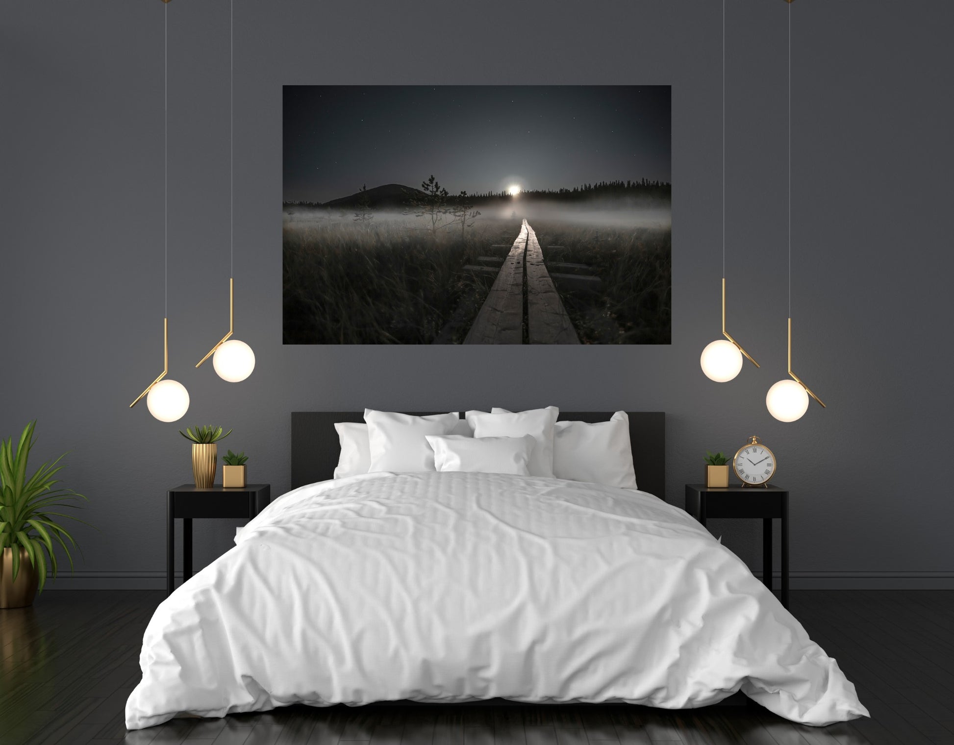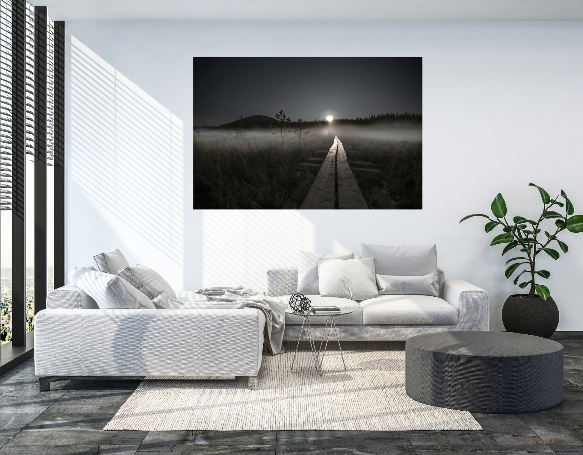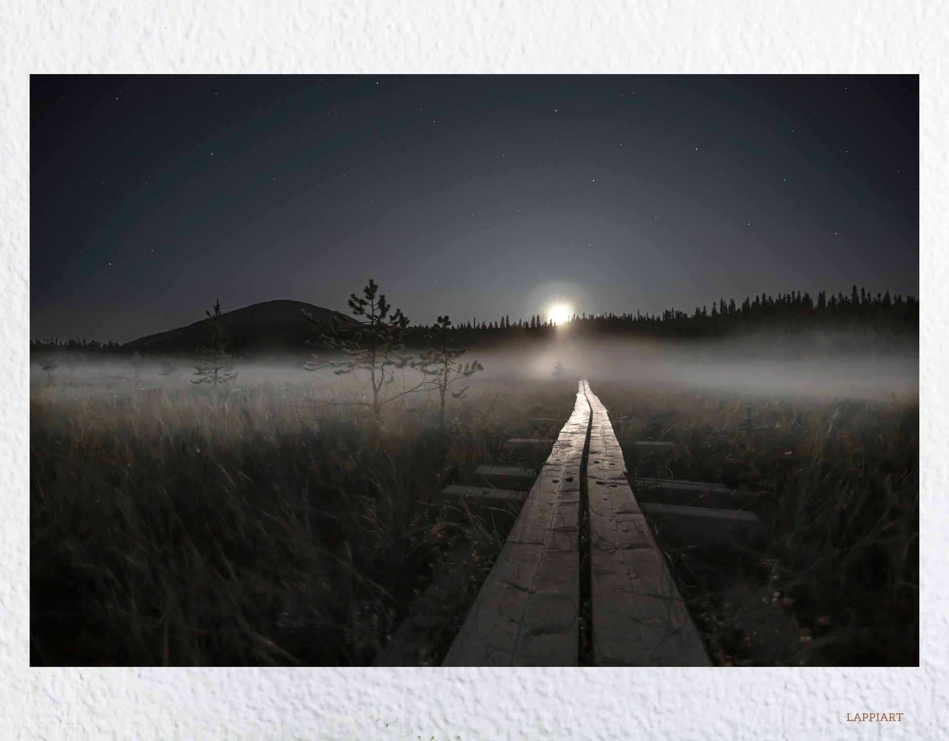 En tiedä mitä entisajan ihmiset ovat ajatelleet, kun ovat astelleet pitkospuita kuun valossa, mutta itse näen kuvassa symboliikkaa ihmismielen varjoisista alueista ja kuun valaisemat pitkospuut tienä kohti valoa.
