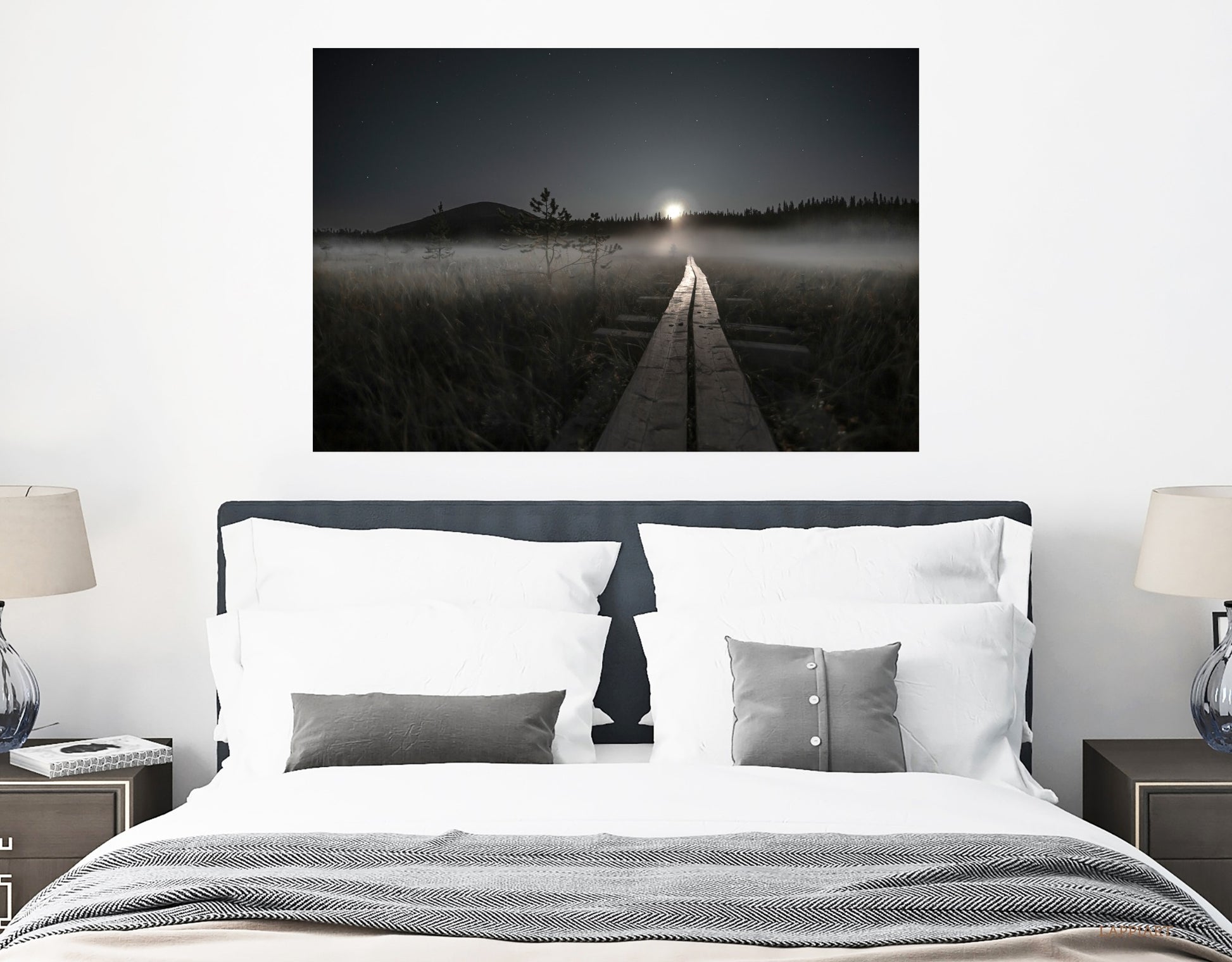 Sumuinen suo ja kuun valju valo. Vaeltajan ajatuksetkin kuin odottavia, maiseman sävyisiä...